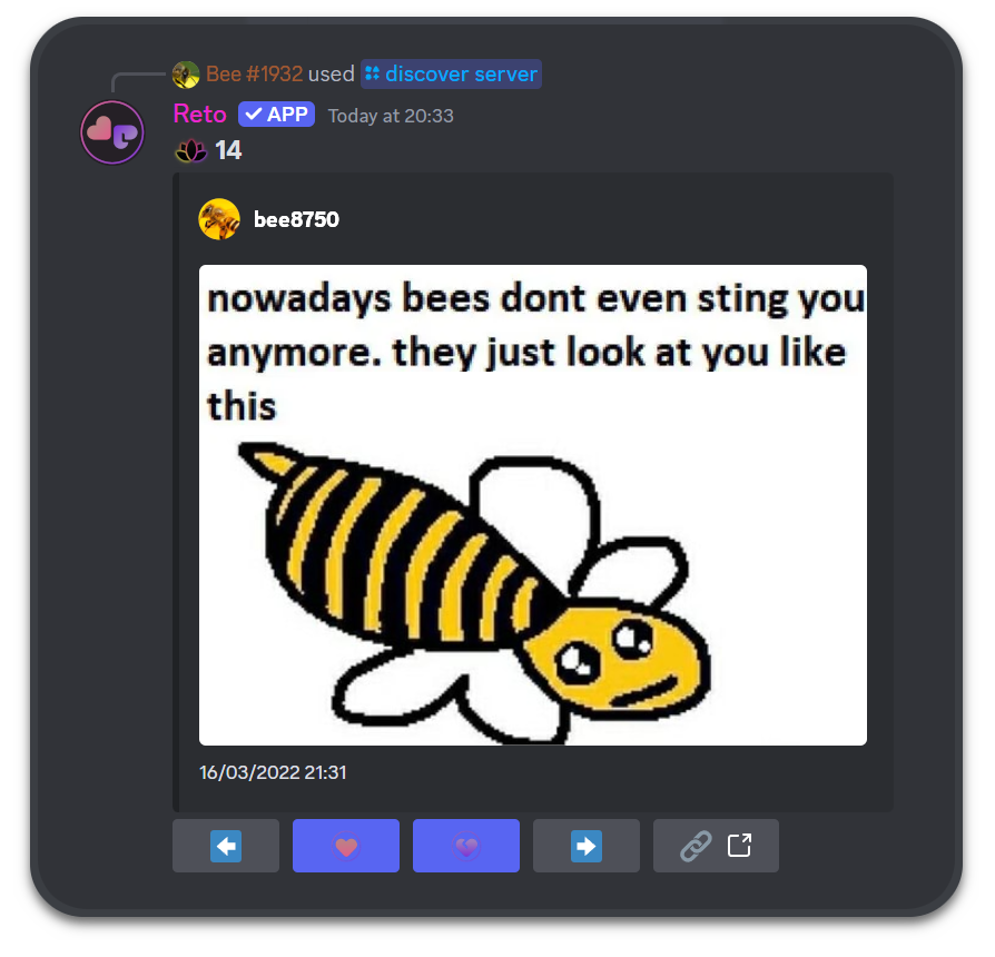 Coming with Retool Open Beta, /discover server is a brand new command that anyone on your server can use. Run it and Reto will send back to you a message from the server you’re on at random!